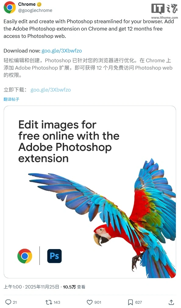 11 月 25 日消息,Adobe Photoshop 今日宣布推出 Chrome 扩展支持,可直接在 Chrome 浏览器中完成图片裁剪、背景移除等功能,无需安装任何桌面软件。